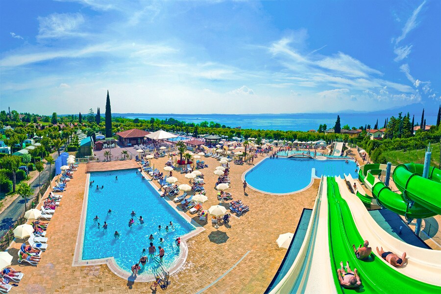 Het grote aquapark van deze Italiaanse camping heeft maar liefst vier zwembaden. De weg naar de zwembaden is niet moeilijk te vinden. Want de grote, kronkelende waterglijbanen steken boven alles uit. Dat wordt dus lekker glijden! De zwembaden van Camping Lido liggen tussen de wijngaarden en het Gardameer. Vanaf een van de ligstoelen kun je perfect genieten van het uitzicht. Vooral de bergen op de achtergrond zijn prachtig.